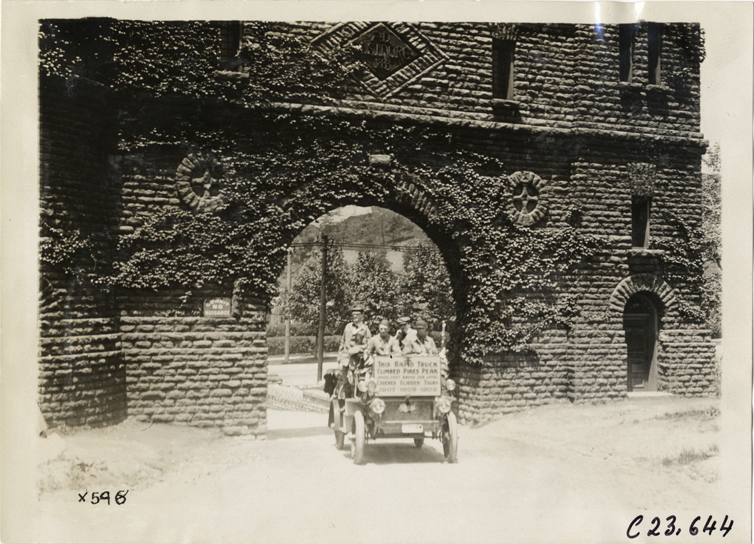 Favorite this☆ Motorists in Rapid truck passing through Elsinore Arch, 1910 Glidden Tour Description: View of motorists in Rapid truck passing under ivy-covered Elsinore Arch in Cincinnati, Ohio during the 1910 Glidden Tour. "A.D. Elsinore, 1883" is inscribed over arch. Sign on truck reads: "This Rapid truck climbed Pikes Peak, 15,000 feet above sea level covered Glidden Tours 1907, 1908, 1909." Handwritten on back: "Tours--Glidden Tour, 1910." Details Resource ID: na024876 Subject: Trucks Rapid Motor Truck Company Gates--Ohio--Cincinnati Glidden Tour (1910) Automobile driving--Competitions--United States Photographic prints Date Issued: 1910 Format: 1 photographic print ; 5 x 7 in. Member of: National Automotive History Collection Lazarnick Collection Filing Location: Tours--Glidden Tour, 1910 #12 Negative Number: Negative #C23,644 Rights: Physical rights are retained by DPL. Copyright is retained in accordance with U.S. copyright laws.