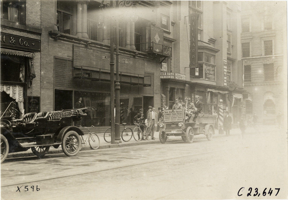 View of motorists in Rapid truck parked next to curb during the 1910 Glidden Tour. Sign on truck reads: "This Rapid truck climbed Pikes Peak, 15,000 feet above sea level covered Glidden Tours 1907, 1908, 1909." Several bicycles on sidewalk; commercial buildings in background. Stamped on back: "Spooner & Wells, Inc., photographers, telephone North 1745. 1231 Woodward Ave., Detroit, Mich. Detroit, 1231 Woodward, New York, 1931 Broadway." Handwritten on back: "Tours--Glidden Tour, 1910."