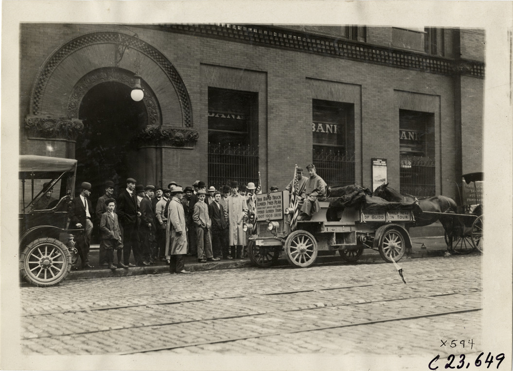 View of motorists in Rapid truck parked in front of bank during the 1910 Glidden Tour. Sign on truck reads: "This Rapid truck climbed Pikes Peak, 15,000 feet above sea level covered Glidden Tours 1907, 1908, 1909." Spectators stand on sidewalk. Handwritten on back: "Tours--Glidden Tour, 1910."
