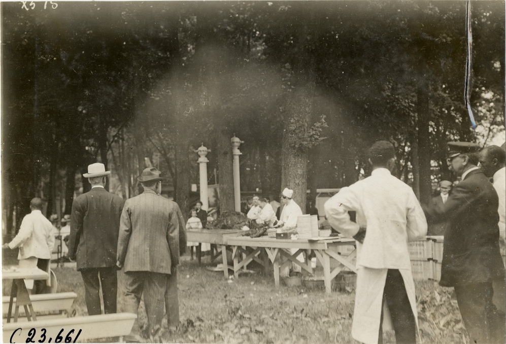 View of several cooks working at long table in preparation for a picnic during the 1910 Glidden Tour. Several men and waiters stand in foreground. Stamped on back: "Spooner & Wells, Inc., photographers, telephone North 1745. 1231 Woodward Ave., Detroit, Mich. Detroit, 1231 Woodward, New York, 1931 Broadway." Handwritten on back: "Tours--Glidden Tour, 1910."