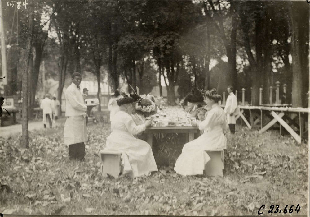 View of women and children sitting at picnic table during the 1910 Glidden Tour. Long tables are covered with tablecloths and food; waiters stand next to tables. Stamped on back: "Spooner & Wells, Inc., photographers, telephone North 1745. 1231 Woodward Ave., Detroit, Mich. Detroit, 1231 Woodward, New York, 1931 Broadway." Handwritten on back: "Tours--Glidden Tour, 1910."