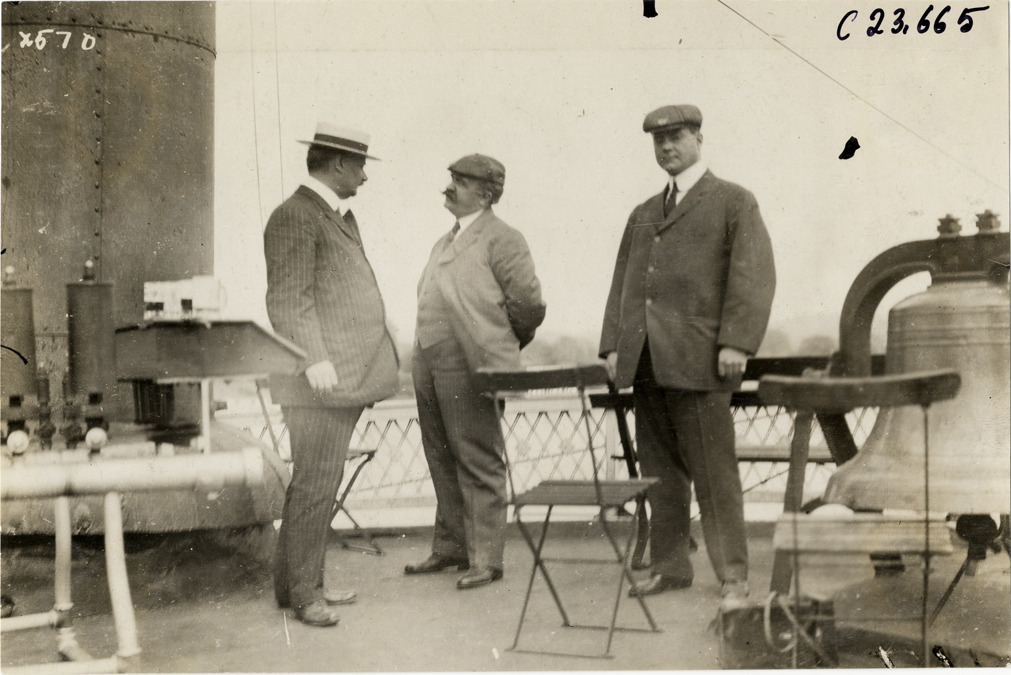 View of three men on deck of steamboat during the 1910 Glidden Tour. Two deck chairs and large bell in foreground. Stamped on back: "Spooner & Wells, Inc., photographers, telephone North 1745. 1231 Woodward Ave., Detroit, Mich. Detroit, 1231 Woodward, New York, 1931 Broadway." Handwritten on back: "Tours--Glidden Tour, 1910."