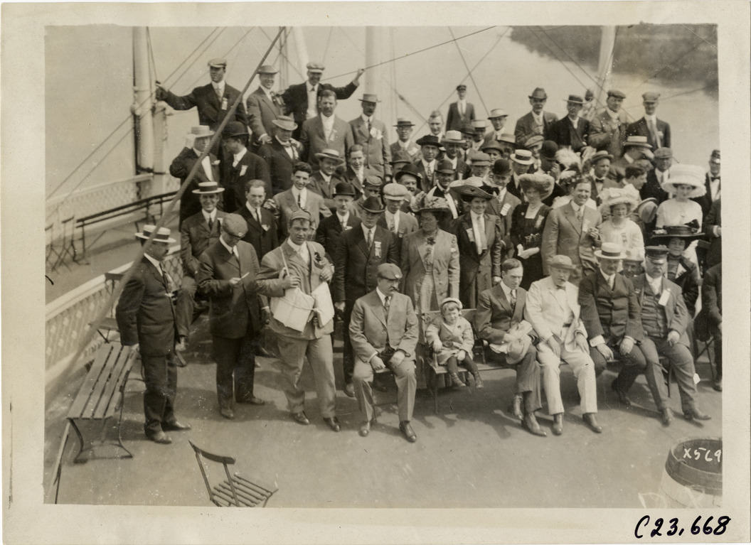 Favorite this☆ Men and women posing on deck of steamboat, 1910 Glidden Tour Description: Group portrait of men and women on deck of steamboat during the 1910 Glidden Tour. Handwritten on back: "Tours--Glidden Tour, 1910." Details Resource ID: na024900 Subject: Portraits, Group Steamboats Glidden Tour (1910) Automobile driving--Competitions--United States Photographic prints Date Issued: 1910 Format: 1 photographic print ; 5.25 x 7 in. Member of: National Automotive History Collection Lazarnick Collection Filing Location: Tours--Glidden Tour, 1910 #13 Negative Number: Negative #C23,668 Rights: Physical rights are retained by DPL. Copyright is retained in accordance with U.S. copyright laws.