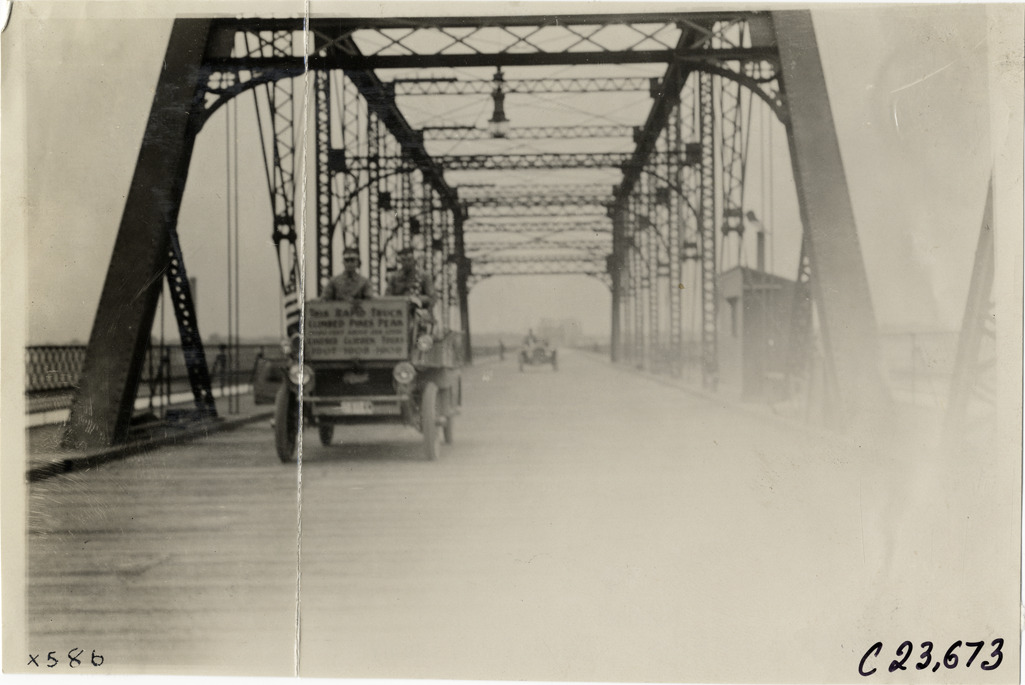 Favorite this☆ Motorists in Rapid truck crossing bridge, 1910 Glidden Tour Description: View of motorists in Rapid truck crossing bridge during the 1910 Glidden Tour. Sign on truck reads: "This Rapid truck climbed Pikes Peak, 15,000 feet above sea level covered Glidden Tours 1907, 1908, 1909." Stamped on back: "Spooner & Wells, Inc., photographers, telephone North 1745. 1231 Woodward Ave., Detroit, Mich. Detroit, 1231 Woodward, New York, 1931 Broadway." Handwritten on back: "Tours--Glidden Tour, 1910." Details Resource ID: na024905 Creator: Spooner & Wells Subject: Trucks Rapid Motor Truck Company Iron and steel bridges Glidden Tour (1910) Automobile driving--Competitions--United States Photographers--Michigan--Detroit Photographic prints Date Issued: 1910 Format: 1 photographic print ; 4.5 x 6.75 in. Member of: National Automotive History Collection Lazarnick Collection Filing Location: Tours--Glidden Tour, 1910 #13 Negative Number: Negative #C23,673 Rights: Physical rights are retained by DPL. Copyright is retained in accordance with U.S. copyright laws.