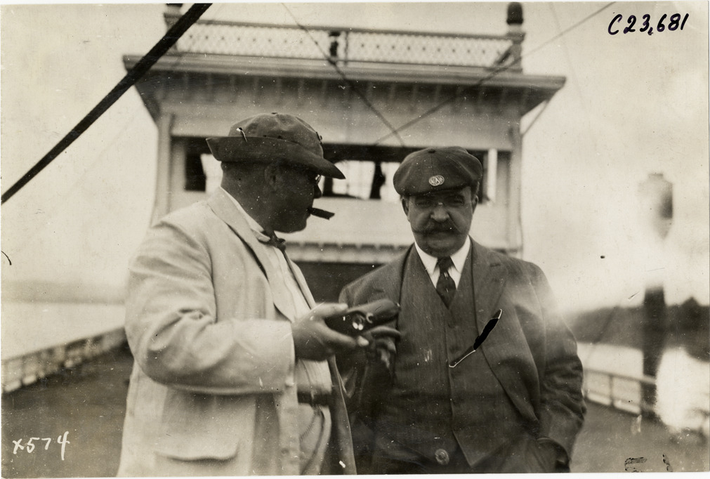 Close-up view of Dai Lewis speaking with official on deck of steamboat during the 1910 Glidden Tour. Stamped on back: "Spooner & Wells, Inc., photographers, telephone North 1745. 1231 Woodward Ave., Detroit, Mich. Detroit, 1231 Woodward, New York, 1931 Broadway." Handwritten on back: "Tours--Glidden Tour, 1910."