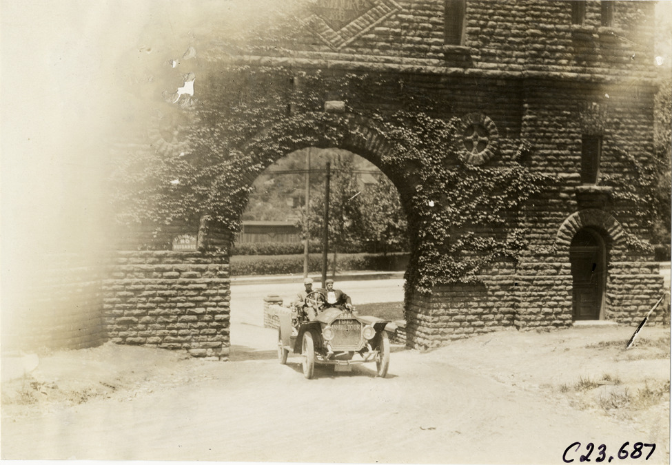 View of motorists in car passing under arch of ivy-covered stone gate during the 1910 Glidden Tour. Stamped on back: "Spooner & Wells, Inc., photographers, telephone North 1745. 1231 Woodward Ave., Detroit, Mich. Detroit, 1231 Woodward, New York, 1931 Broadway." Handwritten on back: "Tours--Glidden Tour, 1910."