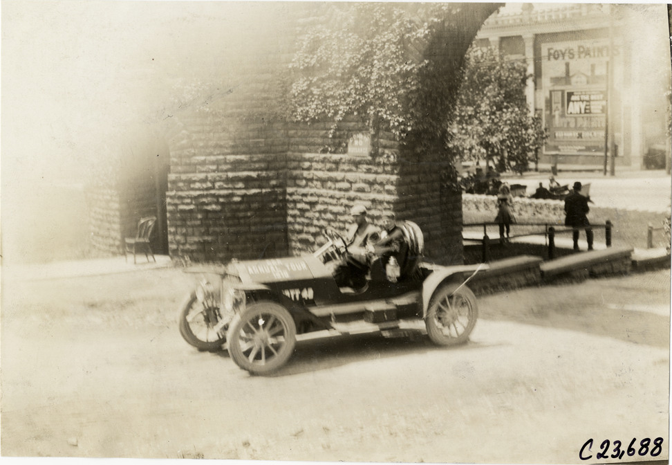 Motorists in automobile passing through stone gate, 1910 Glidden Tour
