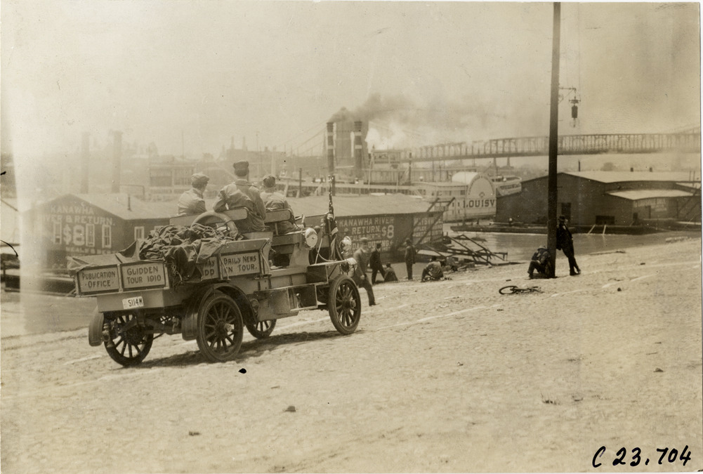 View of motorists in Rapid truck traveling along wharf during the 1910 Glidden Tour. Steamboat "Louis V" and bridge in background. Stamped on back: "Spooner & Wells, Inc., photographers, telephone North 1745. 1231 Woodward Ave., Detroit, Mich. Detroit, 1231 Woodward, New York, 1931 Broadway." Handwritten on back: "Tours--Glidden Tour, 1910."