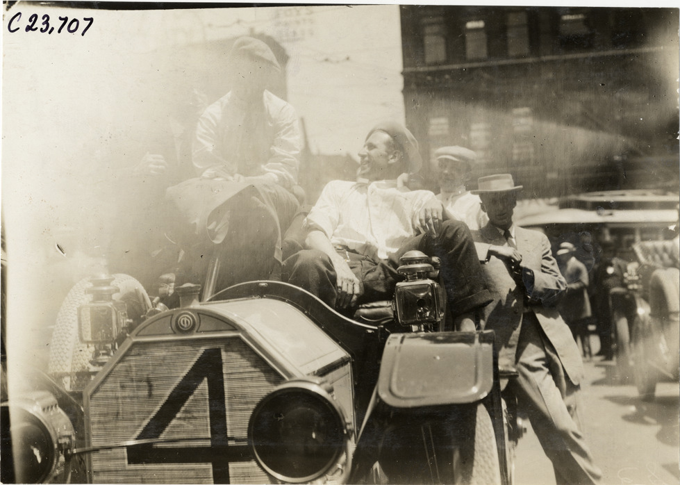 Close-up view of motorists with Chalmers car no. 4 during the 1910 Glidden Tour. Stamped on back: "Spooner & Wells, Inc., photographers, telephone North 1745. 1231 Woodward Ave., Detroit, Mich. Detroit, 1231 Woodward, New York, 1931 Broadway." Handwritten on back: "Tours--Glidden Tour, 1910."