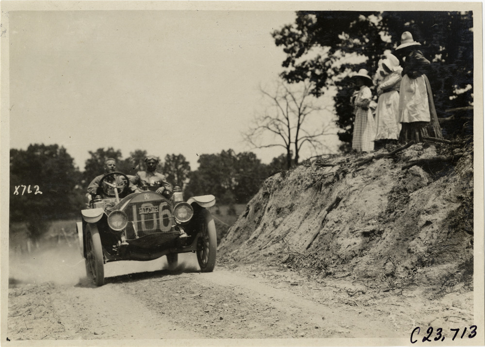 View of motorists in Falcar no. 106 on rural dirt road during the 1910 Glidden Tour. Several women stand on roadside. Stamped on back: "Spooner & Wells, Inc., photographers, telephone North 1745. 1231 Woodward Ave., Detroit, Mich. Detroit, 1231 Woodward, New York, 1931 Broadway." Handwritten on back: "Tours--Glidden Tour, 1910."