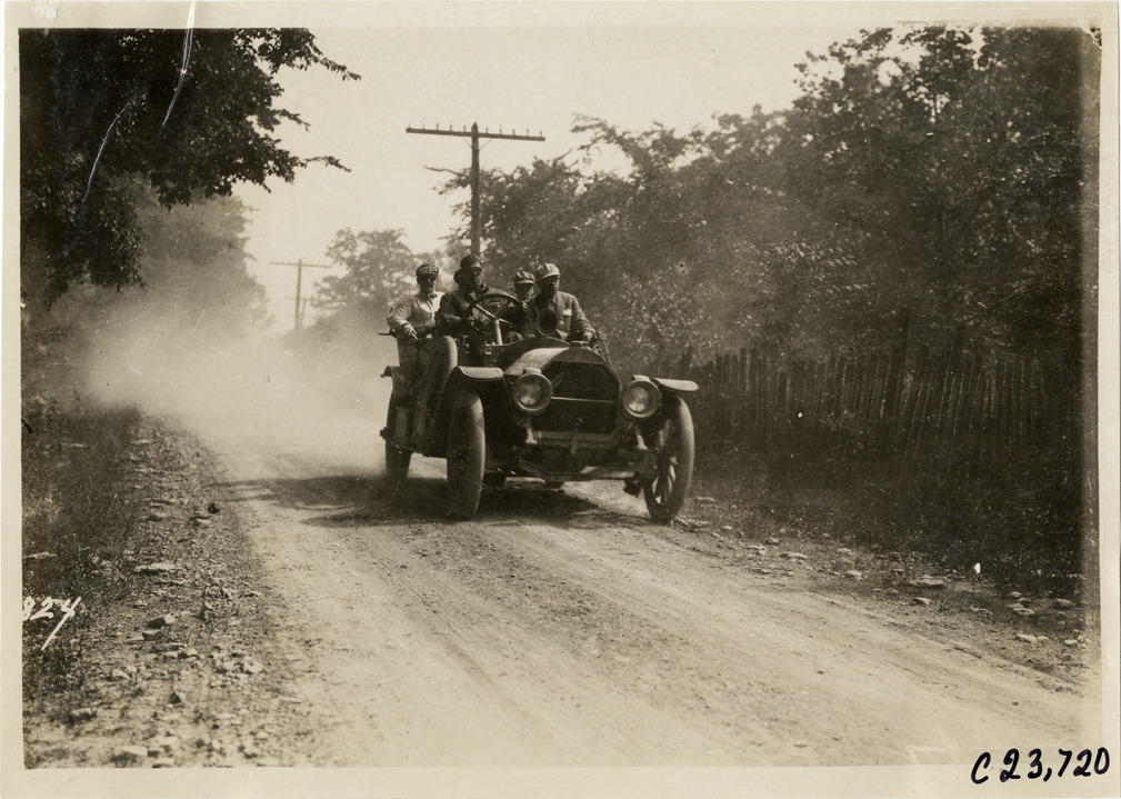 View of motorists in car traveling on rural dirt road during the 1910 Glidden Tour. Stamped on back: "Spooner & Wells, Inc., photographers, telephone North 1745. 1231 Woodward Ave., Detroit, Mich. Detroit, 1231 Woodward, New York, 1931 Broadway." Handwritten on back: "Tours--Glidden Tour, 1910."
