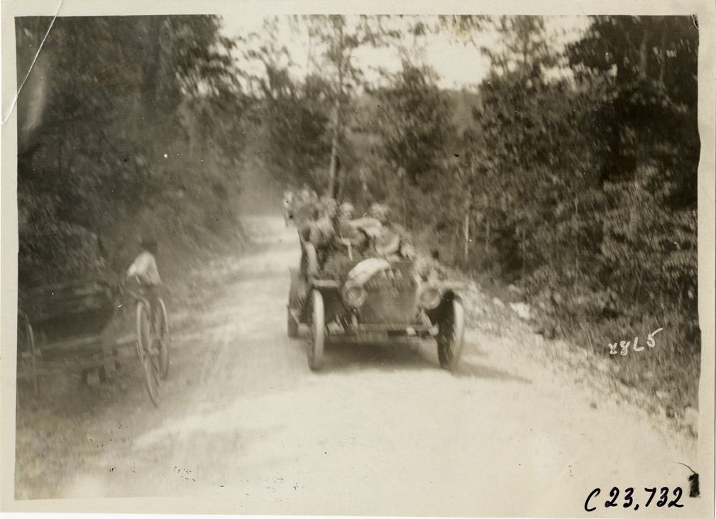 Automobiles traveling on rural road, 1910 Glidden Tour