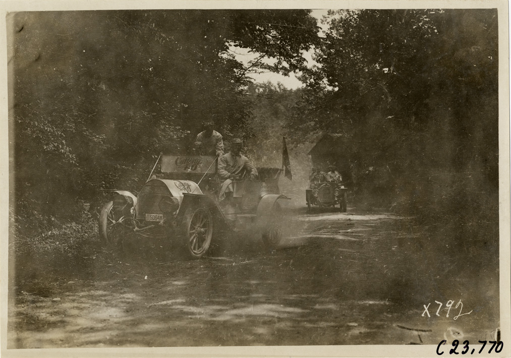 View of motorists in Cutting "40" press car and Premier car no. 2 traveling on rural dirt road during the 1910 Glidden Tour. Stamped on back: "Spooner & Wells, Inc., photographers, telephone North 1745. 1231 Woodward Ave., Detroit, Mich. Detroit, 1231 Woodward, New York, 1931 Broadway." Handwritten on back: "Tours--Glidden Tour, 1910."