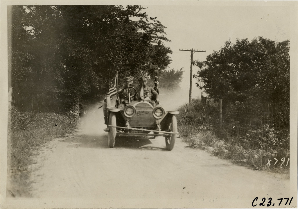 View of motorists in Cadillac car traveling on rural dirt road during the 1910 Glidden Tour. Stamped on back: "Spooner & Wells, Inc., photographers, telephone North 1745. 1231 Woodward Ave., Detroit, Mich. Detroit, 1231 Woodward, New York, 1931 Broadway." Handwritten on back: "Tours--Glidden Tour, 1910."