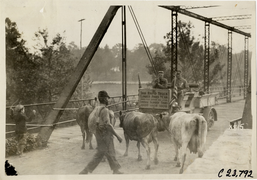 View of motorists in Rapid truck approaching a man with four cows on bridge during the 1910 Glidden Tour. Sign on truck reads: "This Rapid truck climbed Pikes Peak, 15,000 feet above sea level covered Glidden Tours 1907, 1908, 1909." Boy wearing cap stands on left. Stamped on back: "Spooner & Wells, Inc., photographers, telephone North 1745. 1231 Woodward Ave., Detroit, Mich. Detroit, 1231 Woodward, New York, 1931 Broadway." Handwritten on back: "Tours--Glidden Tour, 1910."