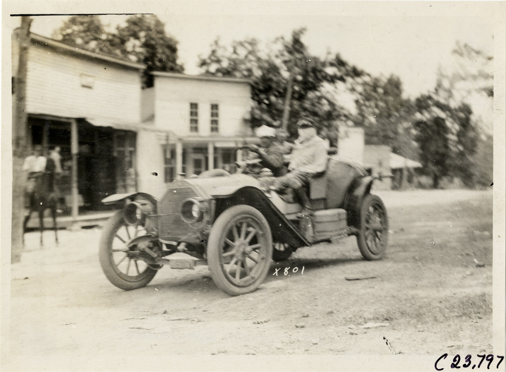 View of motorists posing in car during the 1910 Glidden Tour. Wooden-frame commercial buildings and man on horseback in background. Stamped on back: "Spooner & Wells, Inc., photographers, telephone North 1745. 1231 Woodward Ave., Detroit, Mich. Detroit, 1231 Woodward, New York, 1931 Broadway." Handwritten on back: "Tours--Glidden Tour, 1910."