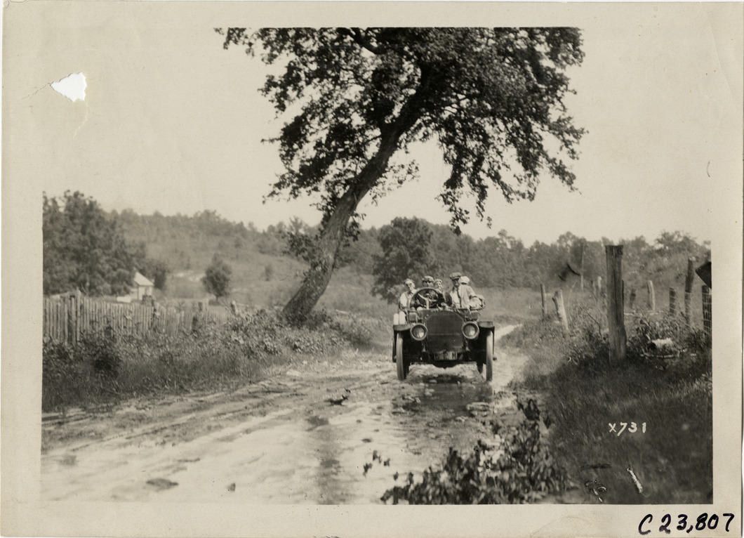 View of motorists in car traveling on a flooded stretch of rural dirt road during the 1910 Glidden Tour. Handwritten on back: "Tours--Glidden Tour, 1910."