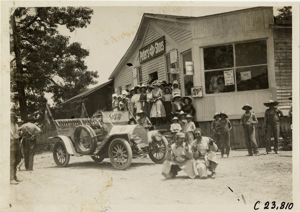 View of two motorists posing in front of Cutting "40" car during the 1910 Glidden Tour. Spectators stand in front of wooden-frame commercial building with "Peter's Shoes" sign in background. Stamped on back: "Spooner & Wells, Inc., photographers, telephone North 1745. 1231 Woodward Ave., Detroit, Mich. Detroit, 1231 Woodward, New York, 1931 Broadway." Handwritten on back: "Tours--Glidden Tour, 1910."