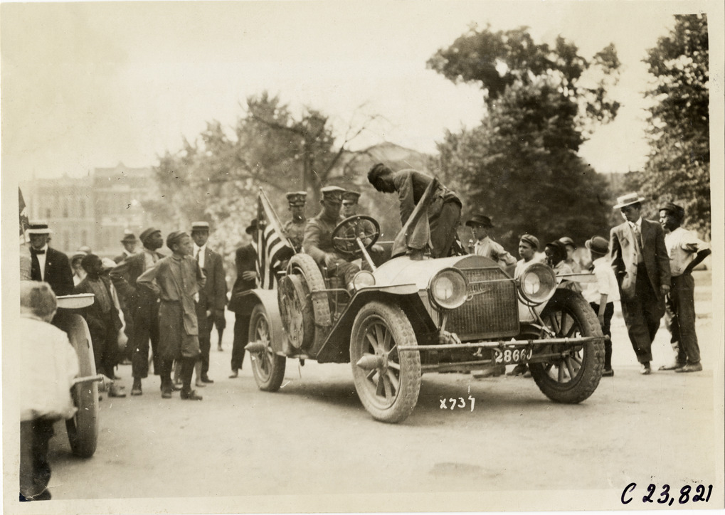 View of spectators surrounding motorists in Cadillac car during the 1910 Glidden Tour. Stamped on back: "Spooner & Wells, Inc., photographers, telephone North 1745. 1231 Woodward Ave., Detroit, Mich. Detroit, 1231 Woodward, New York, 1931 Broadway." Handwritten on back: "Tours--Glidden Tour, 1910."