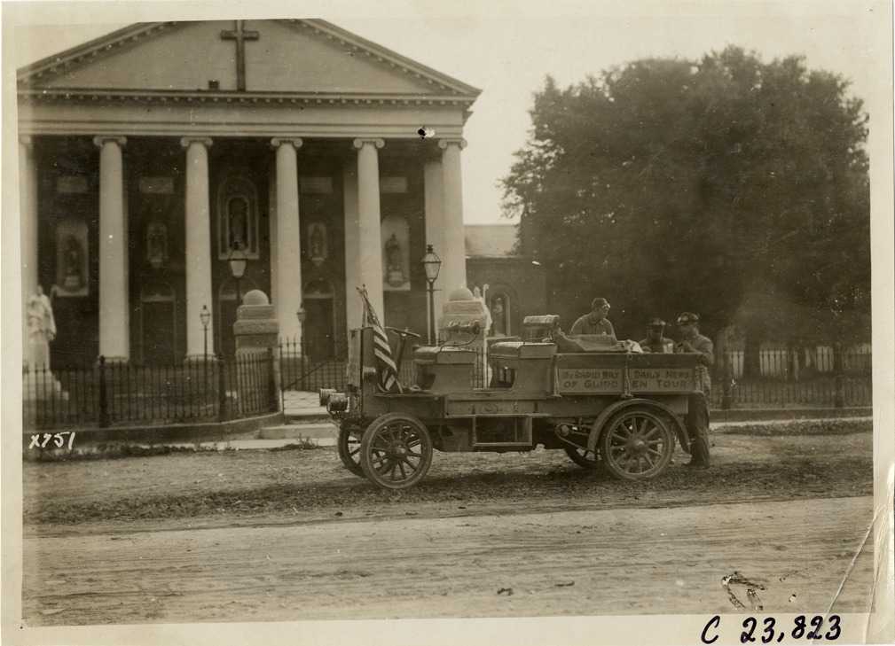 View of motorists with Rapid truck in front of Neoclassical style church building during the 1910 Glidden Tour. Stamped on back: "Spooner & Wells, Inc., photographers, telephone North 1745. 1231 Woodward Ave., Detroit, Mich. Detroit, 1231 Woodward, New York, 1931 Broadway." Handwritten on back: "Tours--Glidden Tour, 1910."