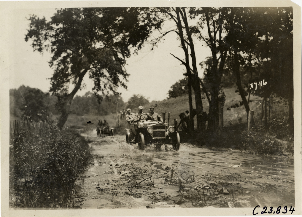Automobiles traveling on muddy rural road, 1910 Glidden Tour