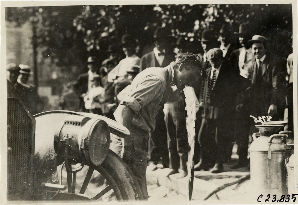 View of motorist leaning over in front of car during the 1910 Glidden Tour. Spectators in background. Stamped on back: "Spooner & Wells, Inc., photographers, telephone North 1745. 1231 Woodward Ave., Detroit, Mich. Detroit, 1231 Woodward, New York, 1931 Broadway." Handwritten on back: "Tours--Glidden Tour, 1910."