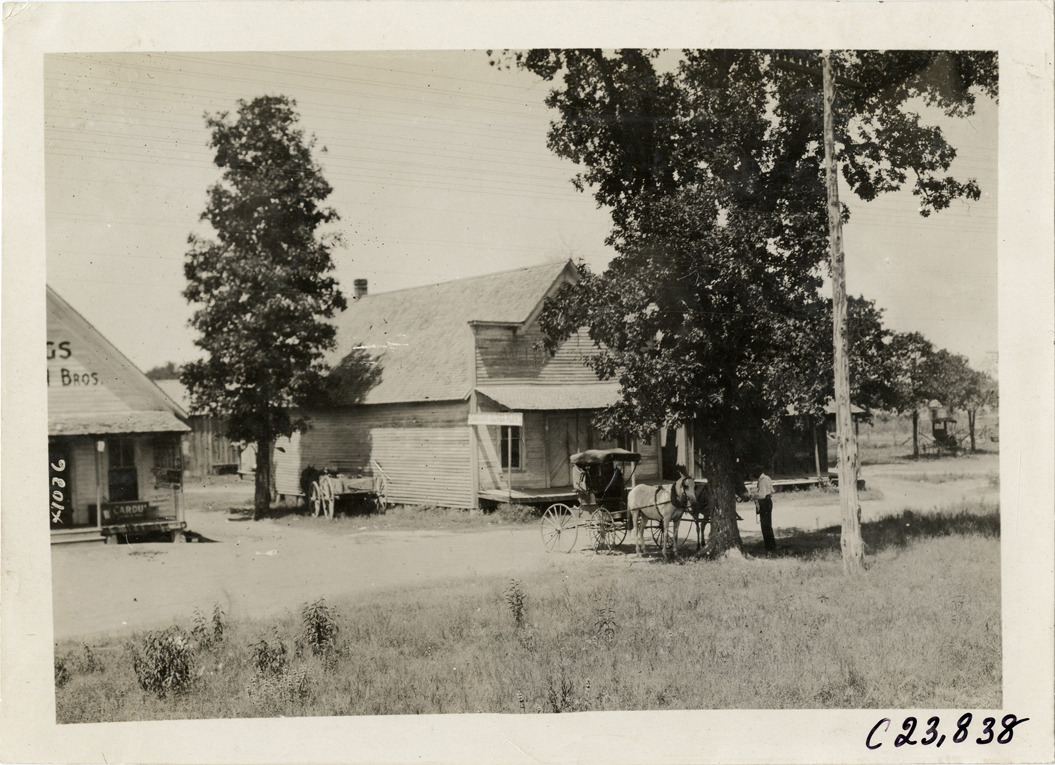 View of horse-drawn carriage in front of row of wooden-frame commercial buildings during the 1910 Glidden Tour. Stamped on back: "Spooner & Wells, Inc., photographers, telephone North 1745. 1231 Woodward Ave., Detroit, Mich. Detroit, 1231 Woodward, New York, 1931 Broadway." Handwritten on back: "Tours--Glidden Tour, 1910."