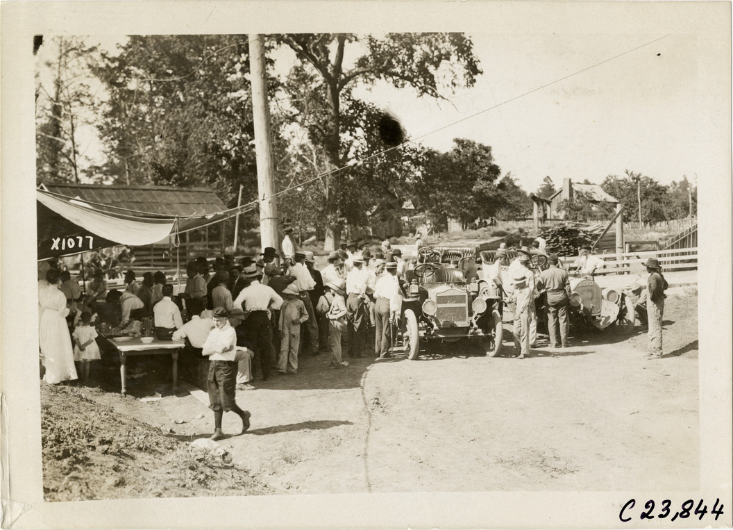 View of spectators surrounding Maxwell car and Premier car no. 2 on rural road during the 1910 Glidden Tour. Some spectators gather around table under tent on left. Stamped on back: "Spooner & Wells, Inc., photographers, telephone North 1745. 1231 Woodward Ave., Detroit, Mich. Detroit, 1231 Woodward, New York, 1931 Broadway." Handwritten on back: "Tours--Glidden Tour, 1910."