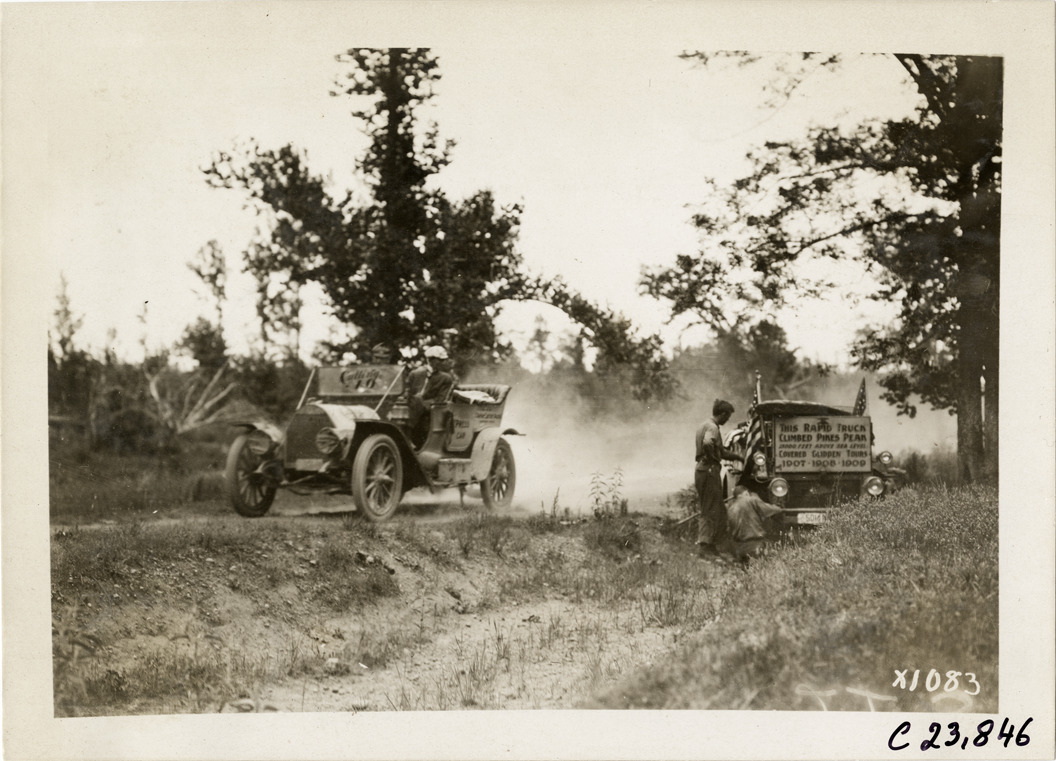 Favorite this☆ Motorists in Cutting automobile passing Rapid truck on roadside, 1910 Glidden Tour Description: View of motorists in Cutting "40" car passing Rapid truck on side of rural dirt road during the 1910 Glidden Tour. Sign on truck reads: "This Rapid truck climbed Pikes Peak, 15,000 feet above sea level covered Glidden Tours 1907, 1908, 1909." Stamped on back: "Spooner & Wells, Inc., photographers, telephone North 1745. 1231 Woodward Ave., Detroit, Mich. Detroit, 1231 Woodward, New York, 1931 Broadway." Handwritten on back: "Tours--Glidden Tour, 1910." Details Resource ID: na025078 Creator: Spooner & Wells Subject: Automobiles Clarke-Carter Automobile Company Trucks Rapid Motor Truck Company Rural roads Glidden Tour (1910) Automobile driving--Competitions--United States Photographers--Michigan--Detroit Photographic prints Date Issued: 1910 Format: 1 photographic print ; 5 x 7 in. Member of: National Automotive History Collection Lazarnick Collection Filing Location: Tours--Glidden Tour, 1910 #20 Negative Number: Negative #C23,846 Rights: Physical rights are retained by DPL. Copyright is retained in accordance with U.S. copyright laws.