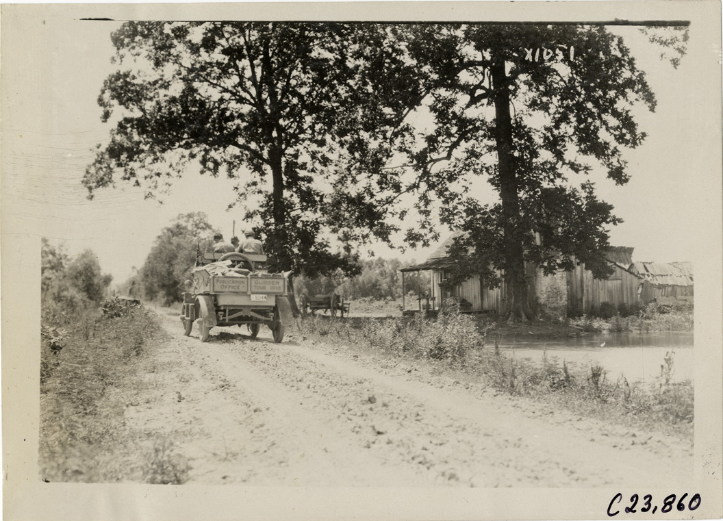 Rear view of motorists in Rapid truck traveling on rural dirt road during the 1910 Glidden Tour. Sign on back of truck reads: "Publication Office, Glidden Tour, 1910." Wooden-frame house on roadside. Handwritten on back: "Tours--Glidden Tour, 1910."