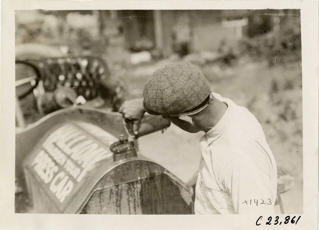 Close-up view of motorist filling radiator of Halladay press car during the 1910 Glidden Tour. Stamped on back: "Spooner & Wells, Inc., photographers, telephone North 1745. 1231 Woodward Ave., Detroit, Mich. Detroit, 1231 Woodward, New York, 1931 Broadway." Handwritten on back: "Tours--Glidden Tour, 1910."