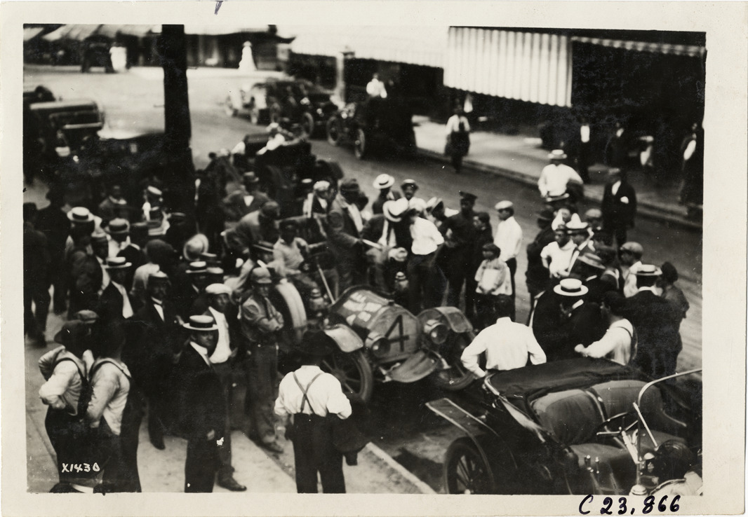 Bird's-eye view of crowd of spectators surrounding Chalmers car no. 4 in street during the 1910 Glidden Tour. Stamped on back: "Spooner & Wells, Inc., photographers, telephone North 1745. 1231 Woodward Ave., Detroit, Mich. Detroit, 1231 Woodward, New York, 1931 Broadway." Handwritten on back: "Tours--Glidden Tour, 1910."