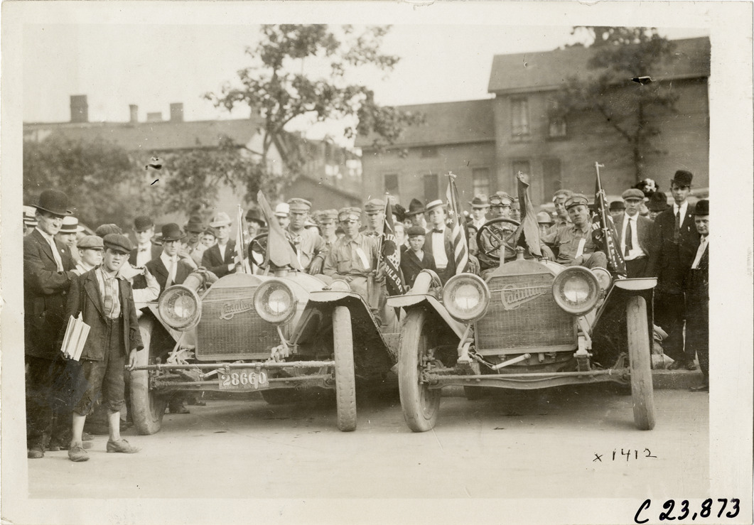 View of motorists posing in two Cadillac cars, surrounded by spectators, during the 1910 Glidden Tour. Commercial buildings in background. Stamped on back: "Spooner & Wells, Inc., photographers, telephone North 1745. 1231 Woodward Ave., Detroit, Mich. Detroit, 1231 Woodward, New York, 1931 Broadway." Handwritten on back: "Tours--Glidden Tour, 1910."