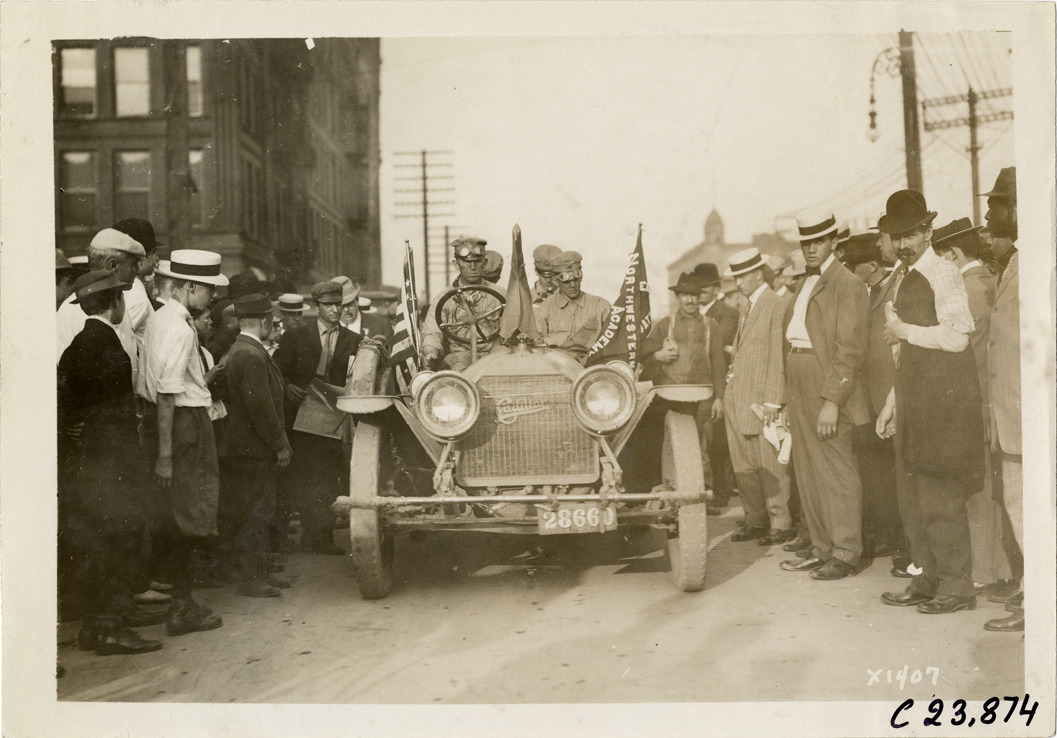View of motorists in Cadillac car, surrounded by spectators, during the 1910 Glidden Tour. Commercial buildings in background. Stamped on back: "Spooner & Wells, Inc., photographers, telephone North 1745. 1231 Woodward Ave., Detroit, Mich. Detroit, 1231 Woodward, New York, 1931 Broadway." Handwritten on back: "Tours--Glidden Tour, 1910."