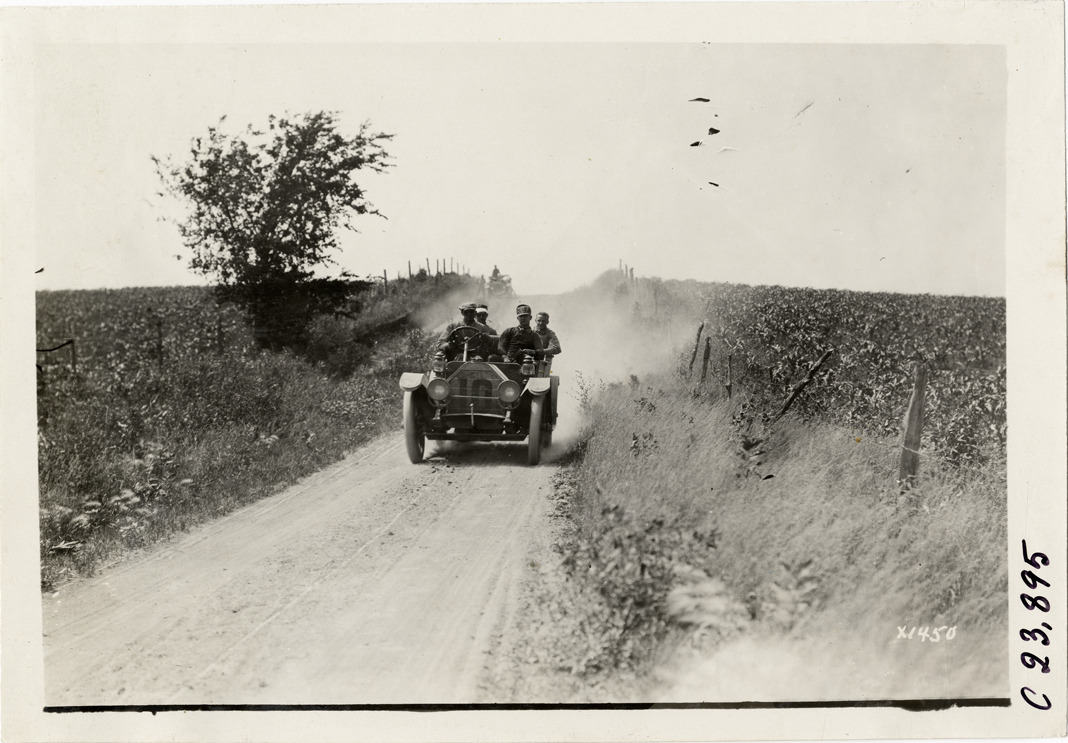 View of motorists in Glide car no. 10 traveling on rural dirt road during the 1910 Glidden Tour. Stamped on back: "Spooner & Wells, Inc., photographers, telephone North 1745. 1231 Woodward Ave., Detroit, Mich. Detroit, 1231 Woodward, New York, 1931 Broadway." Handwritten on back: "Tours--Glidden Tour, 1910."