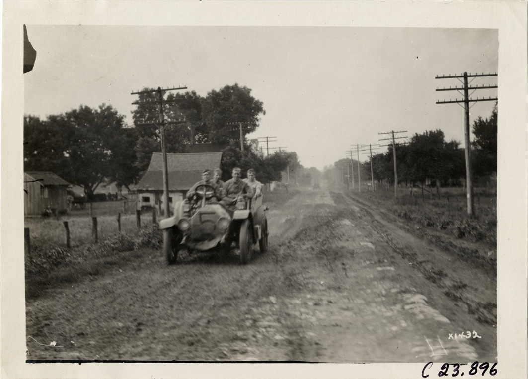View of motorists in Chalmers car no. 5 traveling on rural dirt road during the 1910 Glidden Tour. Stamped on back: "Spooner & Wells, Inc., photographers, telephone North 1745. 1231 Woodward Ave., Detroit, Mich. Detroit, 1231 Woodward, New York, 1931 Broadway." Handwritten on back: "Tours--Glidden Tour, 1910."