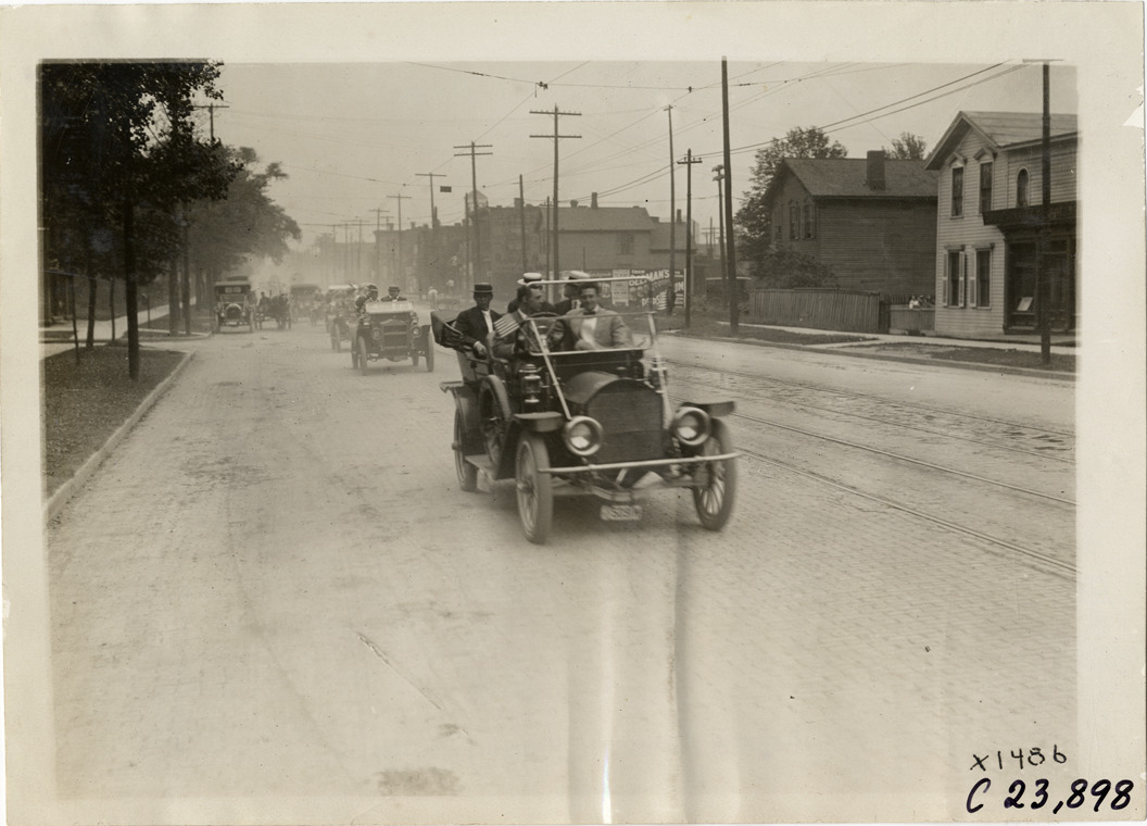 Motorists in automobiles traveling on street, 1910 Glidden Tour