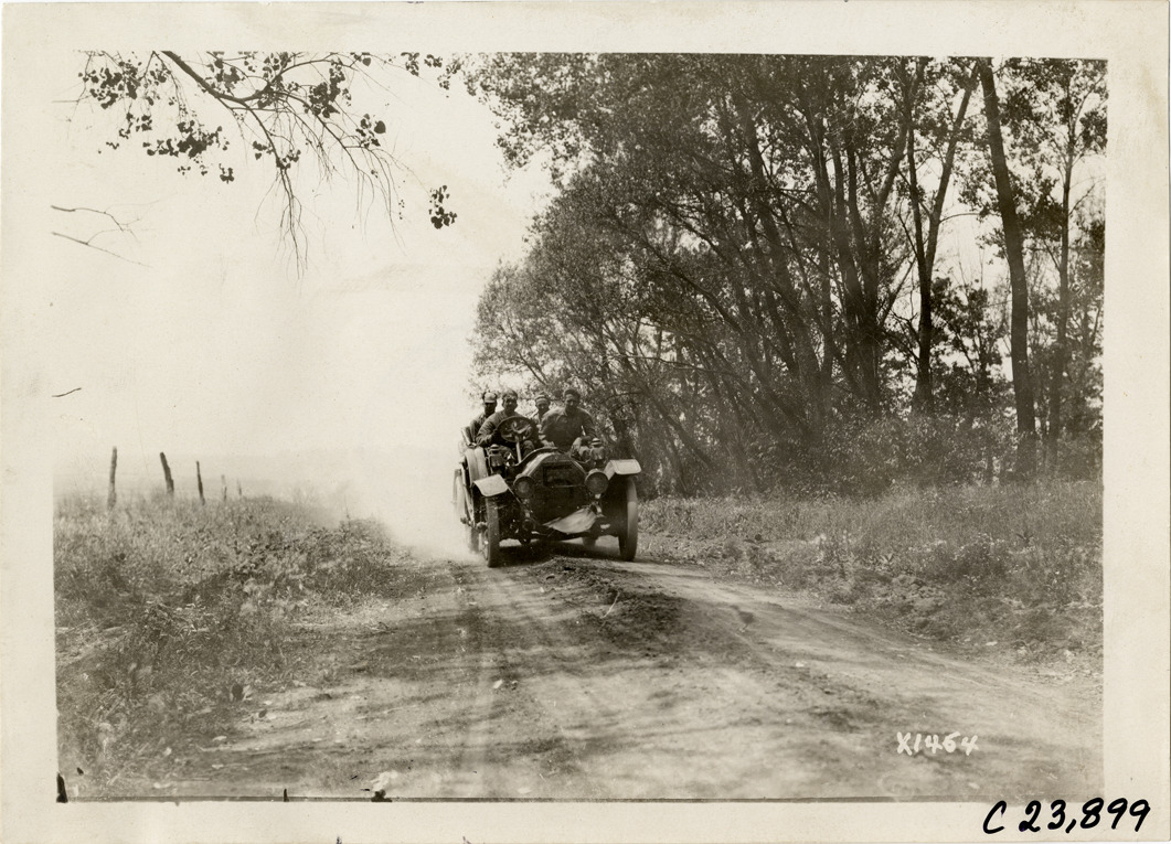 View of motorists in Chalmers car no. 5 traveling on rural dirt road during the 1910 Glidden Tour. Stamped on back: "Spooner & Wells, Inc., photographers, telephone North 1745. 1231 Woodward Ave., Detroit, Mich. Detroit, 1231 Woodward, New York, 1931 Broadway." Handwritten on back: "Tours--Glidden Tour, 1910."