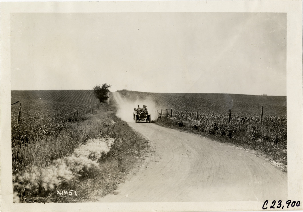 View of motorists in Chalmers car no. 3 traveling on rural dirt road during the 1910 Glidden Tour. Stamped on back: "Spooner & Wells, Inc., photographers, telephone North 1745. 1231 Woodward Ave., Detroit, Mich. Detroit, 1231 Woodward, New York, 1931 Broadway." Handwritten on back: "Tours--Glidden Tour, 1910."