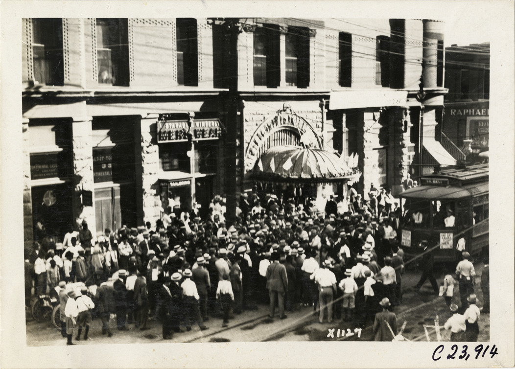 View of crowd in street during the 1910 Glidden Tour. Commercial building with awning on left; streetcar partially visible on right. Stamped on back: "Spooner & Wells, Inc., photographers, telephone North 1745. 1231 Woodward Ave., Detroit, Mich. Detroit, 1231 Woodward, New York, 1931 Broadway." Handwritten on back: "Tours--Glidden Tour, 1910."