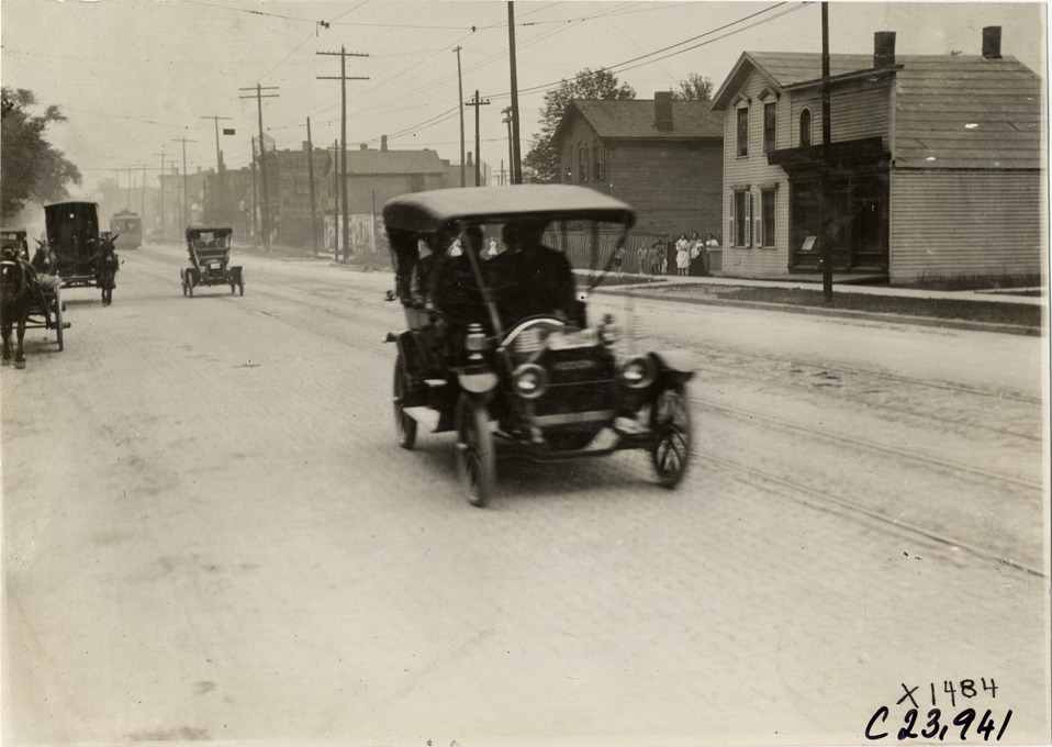 View of two cars traveling on brick street during the 1910 Glidden Tour. Houses, streetcar and horse-drawn vehicles in background. Stamped on back: "Spooner & Wells, Inc., photographers, telephone North 1745. 1231 Woodward Ave., Detroit, Mich. Detroit, 1231 Woodward, New York, 1931 Broadway." Handwritten on back: "Tours--Glidden Tour, 1910."
