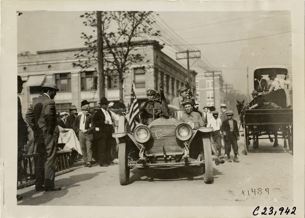 Favorite this☆ Motorists in Cadillac automobile, 1910 Glidden Tour Description: View of motorists in Cadillac car during the 1910 Glidden Tour. Spectators and horse-drawn wagon in background. Handwritten on back: "Tours--Glidden Tour, 1910." Details Resource ID: na025174 Subject: Cadillac automobile Horse-drawn vehicles Glidden Tour (1910) Automobile driving--Competitions--United States Photographic prints Date Issued: 1910 Format: 1 photographic print ; 5 x 7 in. Member of: National Automotive History Collection Lazarnick Collection Filing Location: Tours--Glidden Tour, 1910 #23 Negative Number: Negative #C23,942 Rights: Physical rights are retained by DPL. Copyright is retained in accordance with U.S. copyright laws.