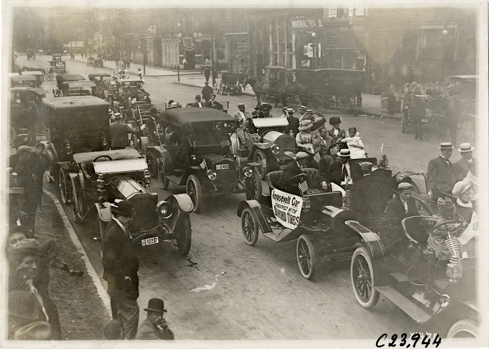 Automobiles lined up in street, 1910 Glidden Tour
