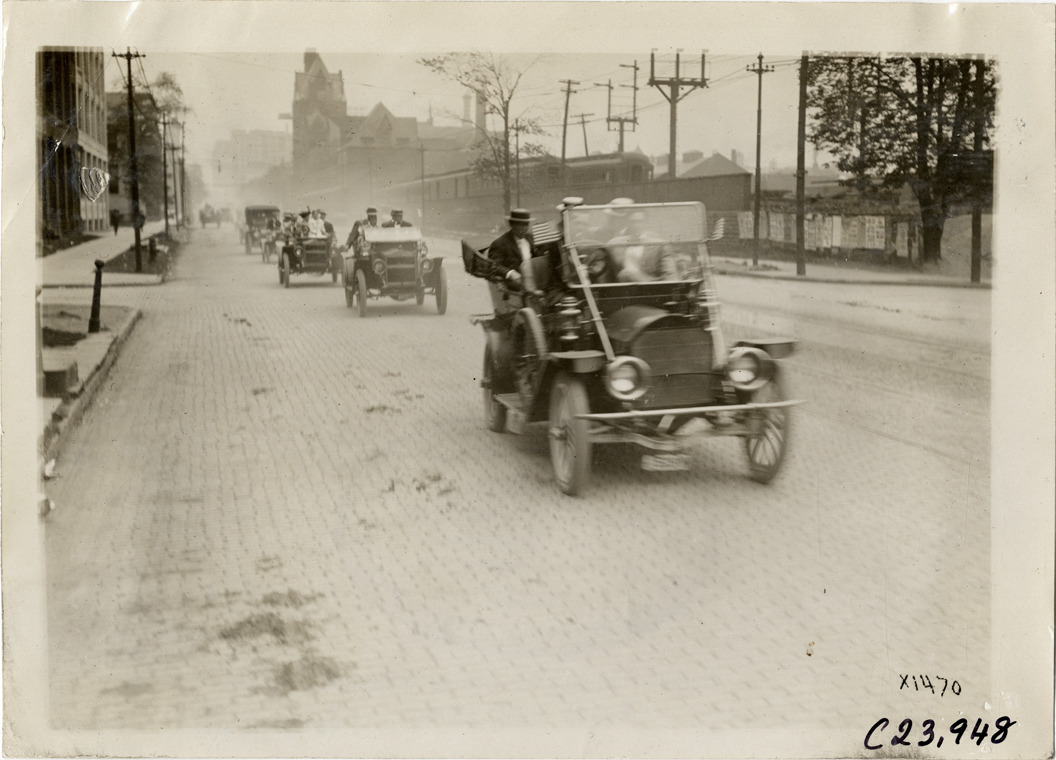 View of several cars traveling on brick street during the 1910 Glidden Tour. Stamped on back: "Spooner & Wells, Inc., photographers, telephone North 1745. 1231 Woodward Ave., Detroit, Mich. Detroit, 1231 Woodward, New York, 1931 Broadway." Handwritten on back: "Tours--Glidden Tour, 1910."