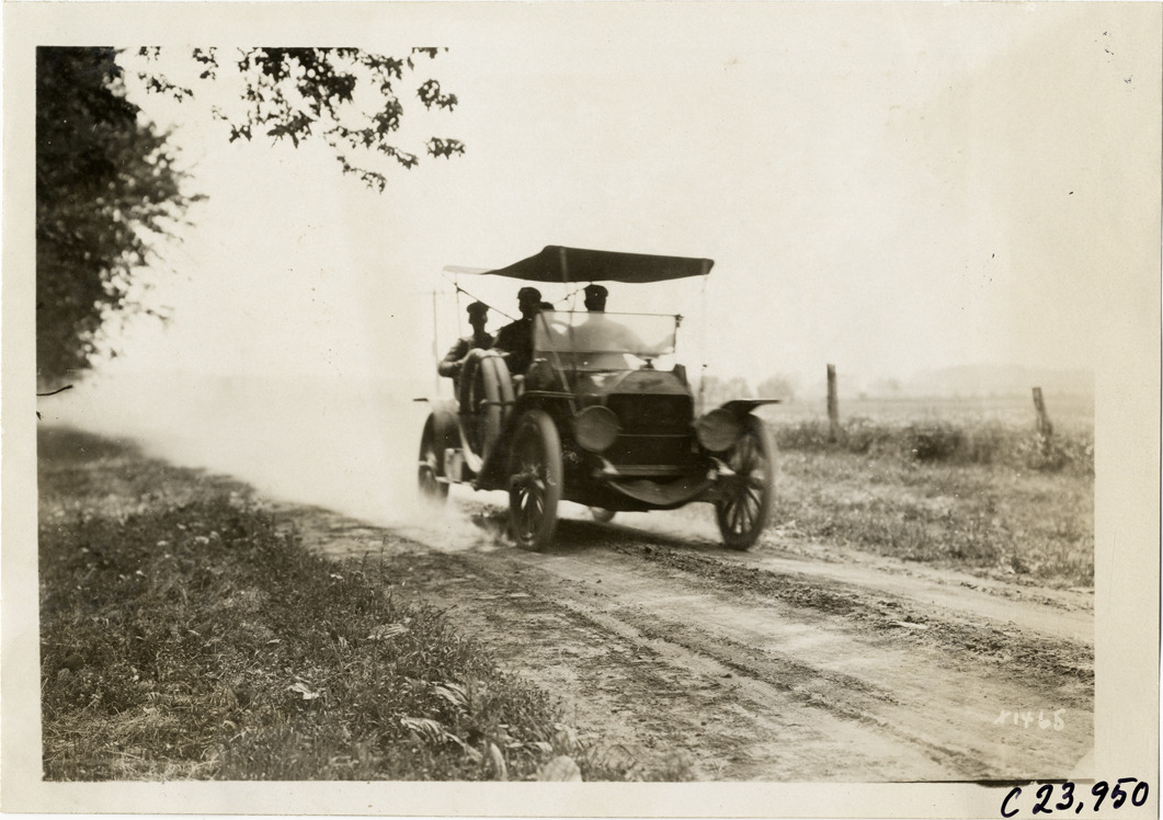 View of motorists in car traveling on rural dirt road during the 1910 Glidden Tour. Stamped on back: "Spooner & Wells, Inc., photographers, telephone North 1745. 1231 Woodward Ave., Detroit, Mich. Detroit, 1231 Woodward, New York, 1931 Broadway." Handwritten on back: "Tours--Glidden Tour, 1910."