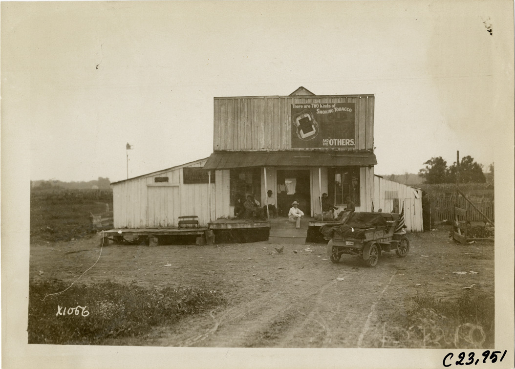 View of Rapid truck parked in front of wooden-frame rural store during the 1910 Glidden Tour. Group of men relax on porch; advertisement for tobacco on building facade. Handwritten on back: "Tours--Glidden Tour, 1910."