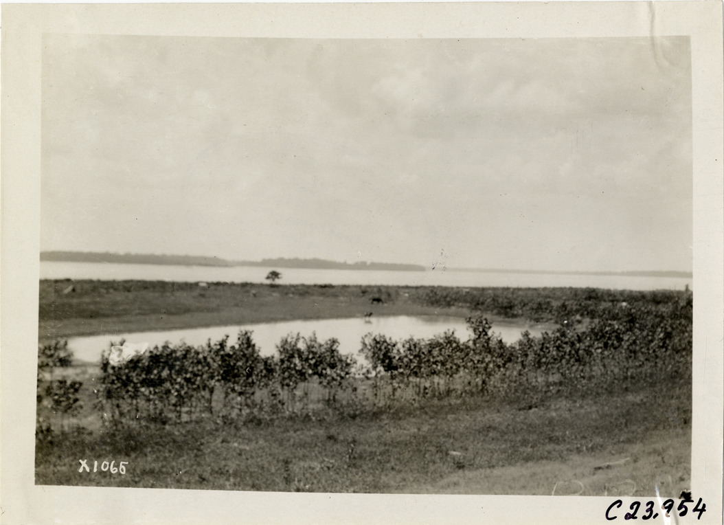 Distant view of lake during the 1910 Glidden Tour. Stamped on back: "Spooner & Wells, Inc., photographers, telephone North 1745. 1231 Woodward Ave., Detroit, Mich. Detroit, 1231 Woodward, New York, 1931 Broadway." Handwritten on back: "Tours--Glidden Tour, 1910."