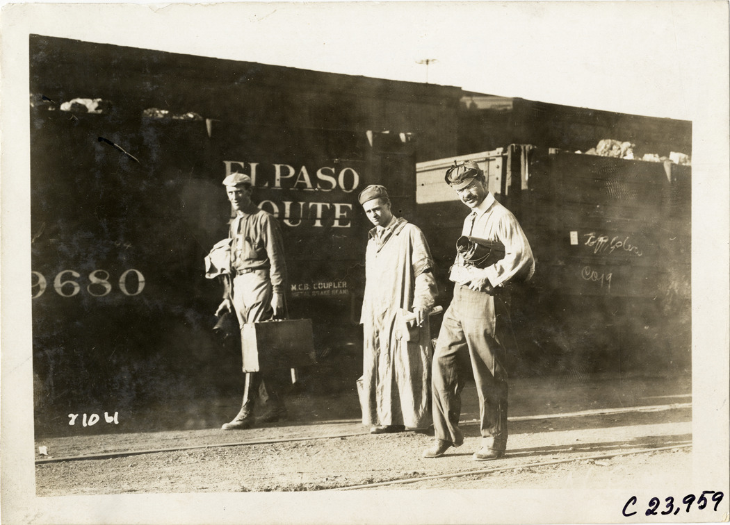 View of three motorists, carrying suitcases and parcels, walking in front of railroad freight cars during the 1910 Glidden Tour. Stamped on back: "Spooner & Wells, Inc., photographers, telephone North 1745. 1231 Woodward Ave., Detroit, Mich. Detroit, 1231 Woodward, New York, 1931 Broadway." Handwritten on back: "Tours--Glidden Tour, 1910."