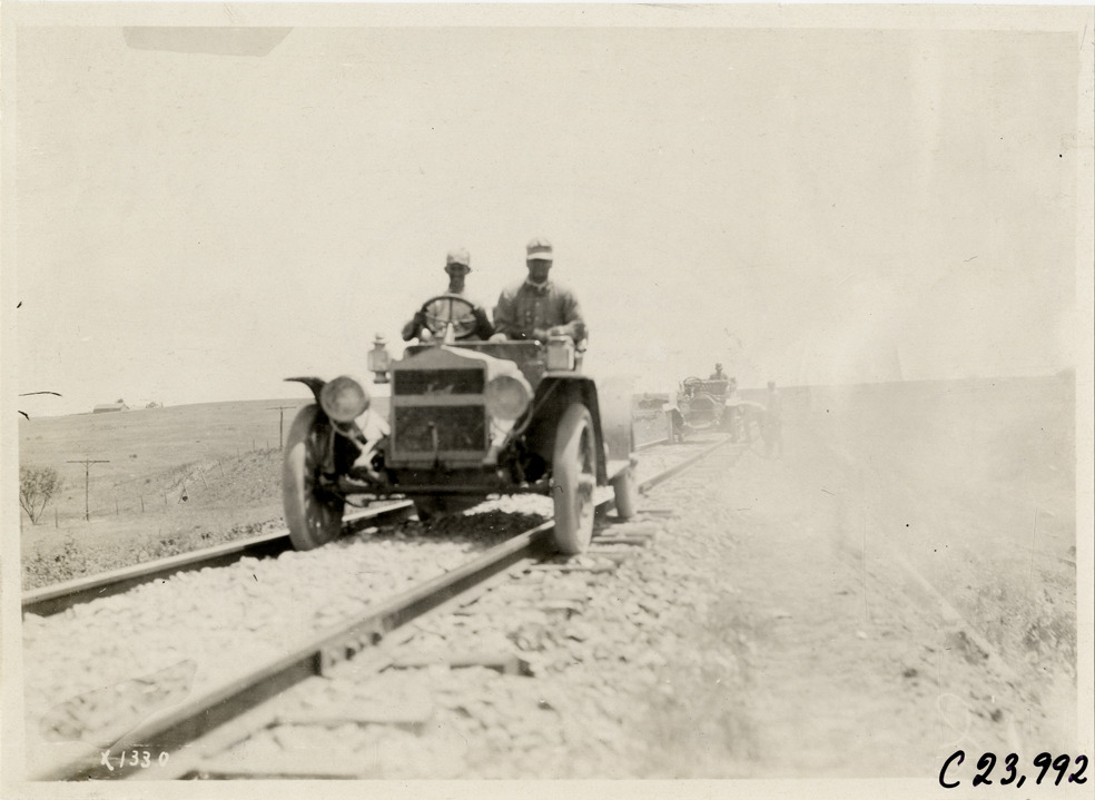 View of motorists in Maxwell car, followed by another car, traveling on railroad tracks during the 1910 Glidden Tour. Stamped on back: "Spooner & Wells, Inc., photographers, telephone North 1745. 1231 Woodward Ave., Detroit, Mich. Detroit, 1231 Woodward, New York, 1931 Broadway." Handwritten on back: "Tours--Glidden Tour, 1910."
