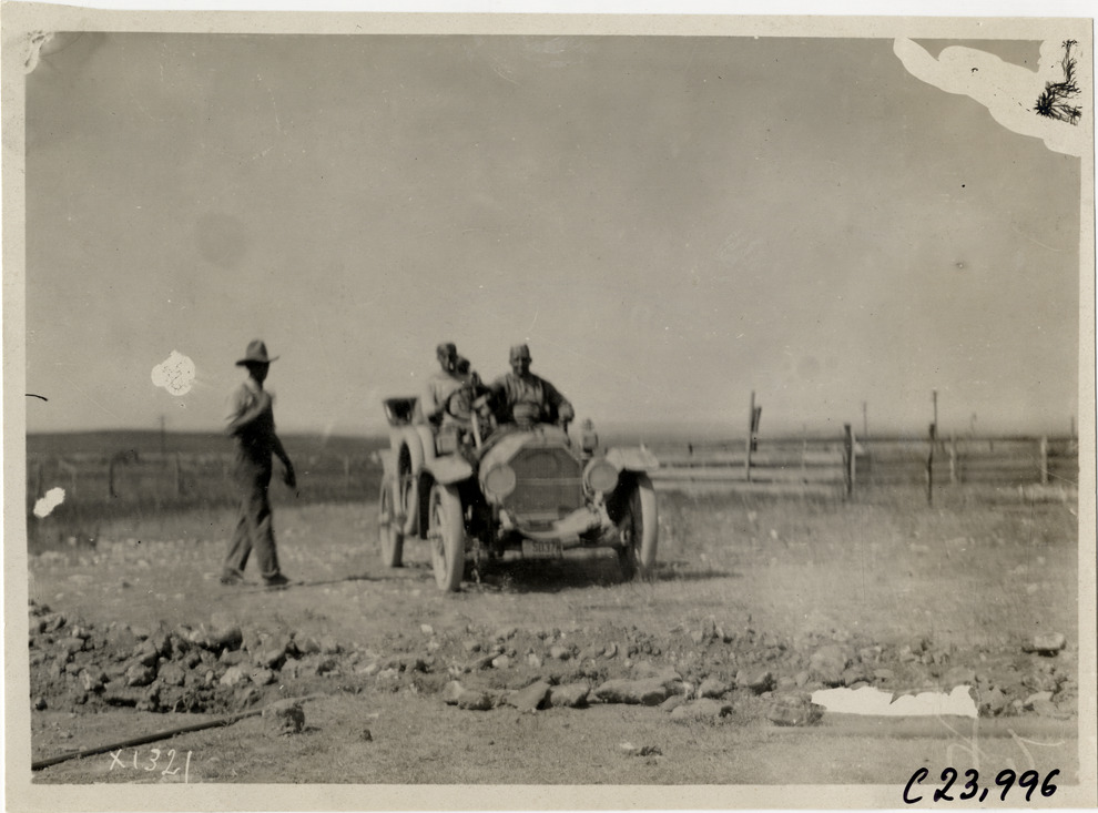 View of motorists posing with Chalmers car no. 3 during the 1910 Glidden Tour. Farmer stands next to car. Stamped on back: "Spooner & Wells, Inc., photographers, telephone North 1745. 1231 Woodward Ave., Detroit, Mich. Detroit, 1231 Woodward, New York, 1931 Broadway." Handwritten on back: "Tours--Glidden Tour, 1910."